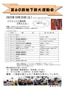 10月25日(土)に開催される「第60回地下鉄大運動会」のプログラムとなります。 組合員、ご家族の皆さんに楽しんでいただけるプログラムが盛りだくさんとなっていますので、是非多くの方のご来場をお待ちしております。