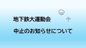10月25日(土)に開催を予定していた、第60回地下鉄大運動会につきましては、降雨が見込まれるため、中止の判断をさせていただきました。ご家族含め楽しみにされていた方もいらっしゃると思いますが、ご理解のほどよろしくお願い