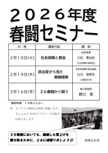 教育文化部では、26春闘に向けた情勢認識の共有や意思固めを目的に、毎年春闘セミナーを開催しております。 今年度についても、添付資料の日程で開催しますので、ご参加をお待ちしております。 なお、Zoomでの配信も実施い