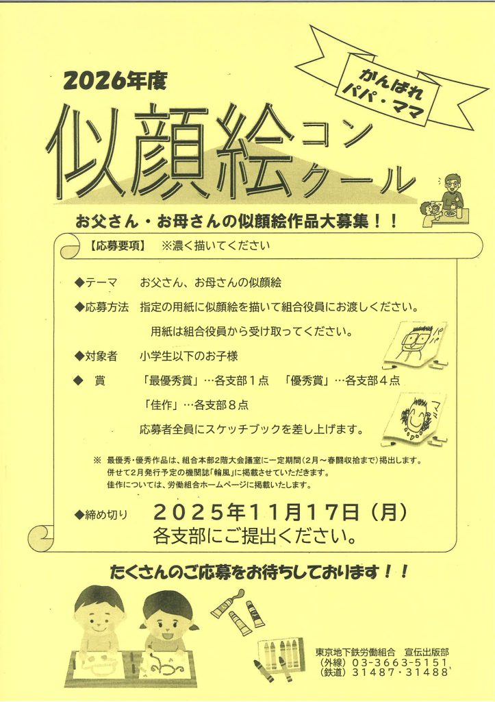 似顔絵コンクールのお知らせ 毎年多くの皆さんにご応募をいただいている似顔絵コンクールを、今年も実施いたします。 パパ・ママいずれかの似顔絵を描いて、11月17日までにご応募ください!最優秀賞・優秀賞の作品については、来年2月発行予定の「輪風96号」に、佳作については、労働組合ホームページに掲載をいたします。 多くの皆さんのご応募をお待ちしております。 宣伝出版部